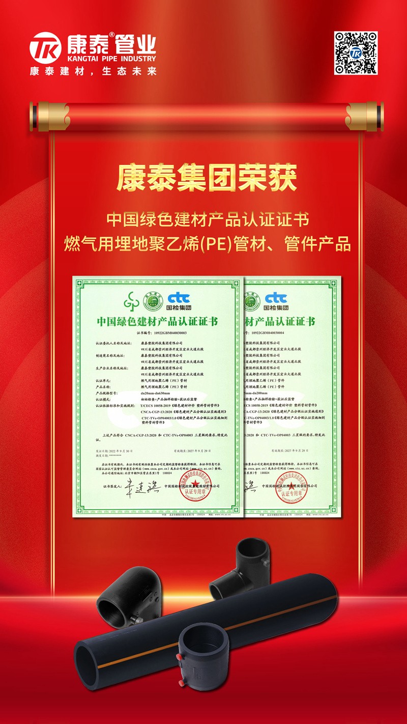 近日,康泰塑膠的給水用聚乙烯(PE)管材、管件產(chǎn)品,燃氣用埋地聚乙烯(PE)管材、管件產(chǎn)品,冷熱水用聚丙烯(PPR)管材、管件產(chǎn)品,埋地用聚乙烯(PE)雙壁波紋管材產(chǎn)品,冷熱水用耐熱聚乙烯(PE-RT)管材產(chǎn)品,給水用鋼絲網(wǎng)增強聚乙烯復合管材產(chǎn)品順利中國國檢測試控股集團股份有限公司認證審核,獲得中國綠色產(chǎn)品認證證書。充分展現(xiàn)了康泰塑膠獲證產(chǎn)品在多種綠色屬性和考核指標的硬核實力。