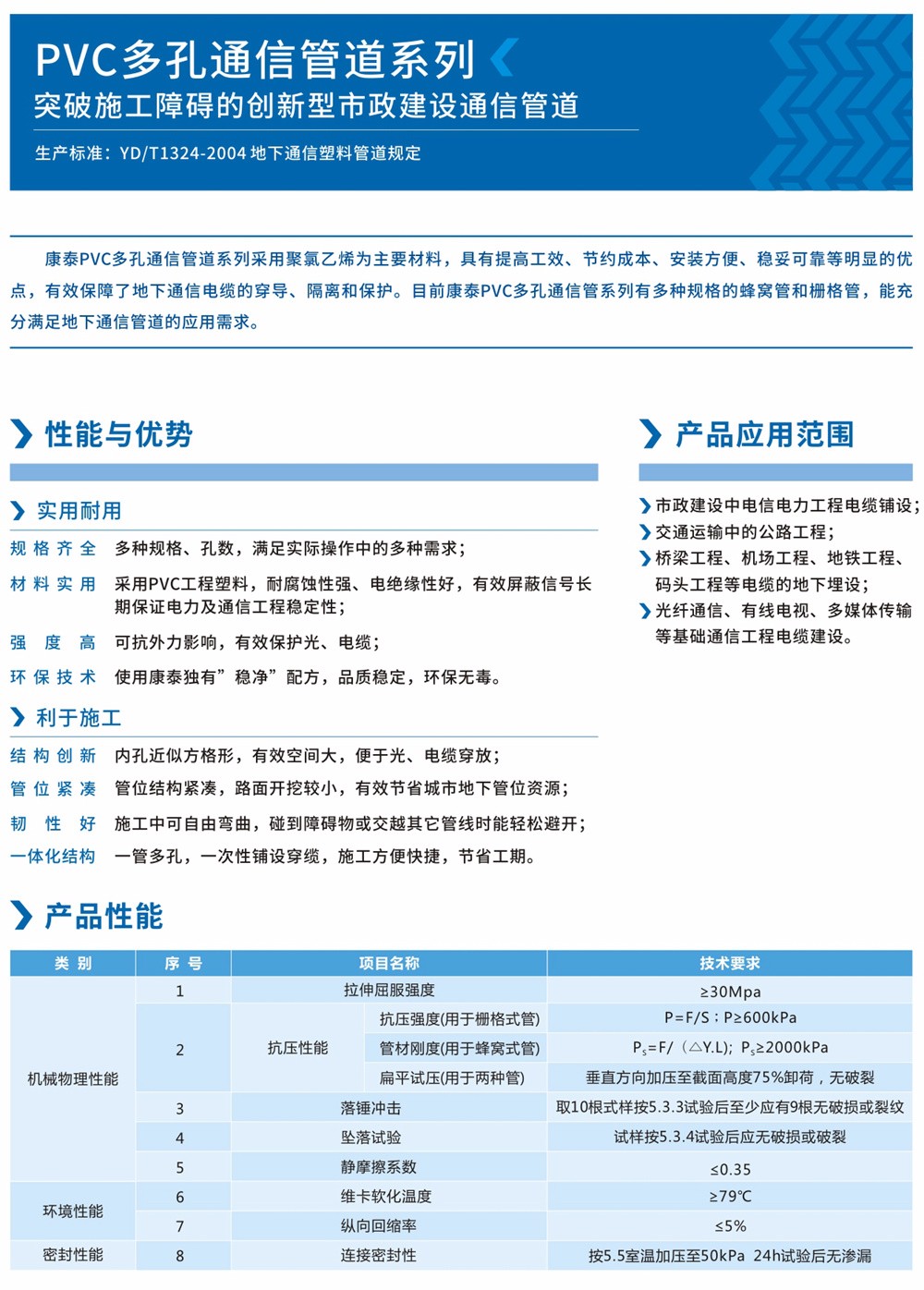 PVC多孔通信管道用PVC多孔管制作材料采用聚氯乙烯為主,代替?zhèn)鹘y(tǒng)的水泥管塊,鋼管套管等保護(hù)套,用于對(duì)地下通信電纜的穿導(dǎo)、隔離和保護(hù),具有提高工效、節(jié)約成本、安裝方便、穩(wěn)妥可靠等明顯的優(yōu)點(diǎn),逐步在地下通信管道中得到廣泛應(yīng)用。
