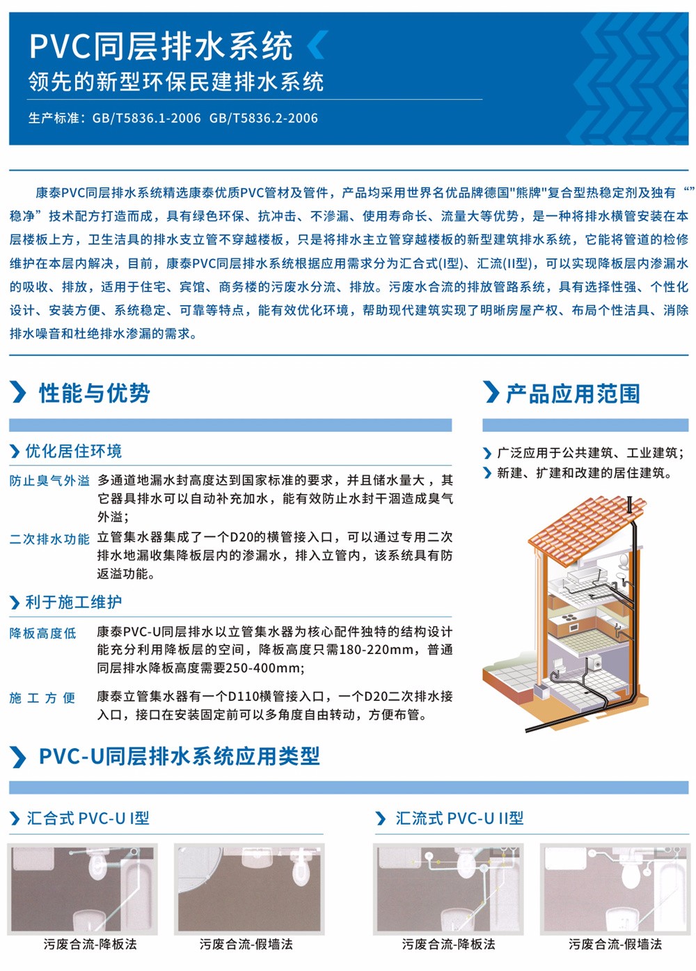 康泰PVC同層排水系統(tǒng)精選康泰優(yōu)質(zhì)PVC管材及管件,產(chǎn)品均采用世界名優(yōu)品牌德國“熊牌”復(fù)合型熱穩(wěn)定劑及獨(dú)有“穩(wěn)凈”技術(shù)配方打造而成 ,具有綠色環(huán)保、抗沖擊、不滲漏、使用壽命長、流量大等優(yōu)勢,是一種將排水橫管安裝在本層樓板上方,衛(wèi)生潔具的排水支立管不穿越樓板,只是將排水主立管穿越樓板的新型建筑排水系統(tǒng),它能將管道的檢修維護(hù)在本層內(nèi)解決。目前,康泰PVC同層排水系統(tǒng)根據(jù)應(yīng)用需求分為匯合式(I型)、匯流式(Ⅱ型),可以實(shí)現(xiàn)降板層內(nèi)滲漏水的吸收、排放,適用于住宅、賓館、商務(wù)樓的污廢水分流、排放,污廢水合流的排放管路系統(tǒng),具有選擇性強(qiáng)、個(gè)性化設(shè)計(jì)、安裝方便、系統(tǒng)穩(wěn)定、可靠等特點(diǎn),能有效優(yōu)化環(huán)境,幫助現(xiàn)代建筑實(shí)現(xiàn)了明晰房屋產(chǎn)權(quán)、布局個(gè)性潔具、消除排水噪音和杜絕排水滲漏的需求。